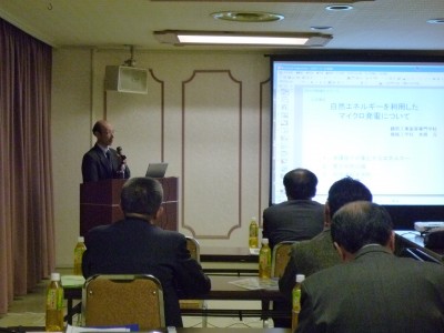 2011年12月2日 / 最終更新日時 : 2011年12月2日 システム管理者 お知らせ 11月22日(火) 酒田商工会議所・さかた技術者ネットワーク様にて出前講座を行いました •演題 「自然エネルギーを利用したマイクロ発電について」 鶴岡工業高等専門学校 機械工学科 本 橋 元 教授 今年、社会的にも注目され家庭や個人でも積極的に導入されつつある『自然エネルギー』。 太陽電池や水力・風力発電についての概要・発電の仕組みを説明しながら、地元で試験中の農業用水路での水力発電について講演。 その用水路では、想定していなかった様々な問題が発生、それらを克服しながら次への課題に取り組んでいる様子を紹介しました。