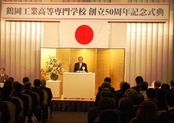 記念式典には、来賓、同窓会、後援会、旧教職員、現教職員及び学生の約500名が出席。加藤校長の式辞に続いて、来賓として出席された文部科学大臣(高等教育局牛尾専門教育課長代読)、国立高専機構理事長、山形県知事(佐藤庄内総合支庁長代読)、鶴岡市長、山形大学長、長岡技術科学大学長の祝辞が述べられた後、映像により本校の歩みが紹介されました。また、同窓会組織である峰友会から校長にワゴン車の寄贈があった他、本校の教育研究環境の充実に貢献された2個人(絵画を寄贈くださった谷口奈美子さん、ロゴマーク考案の坂口知永さん)、1団体(峰友会)に校長から感謝状が手渡されました。