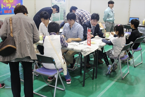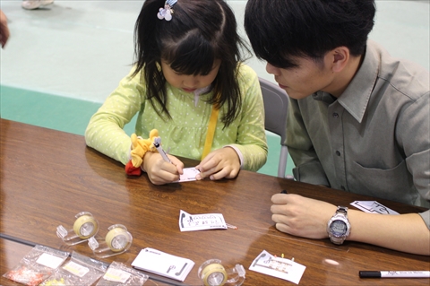 19日(日)は、佐藤淳研究室が「お手軽、紙とペンを使った電子工作」を行い、瀬川研究室が「暗闇で光るストラップ作り」を行い、子どもに大人気の企画となりました。