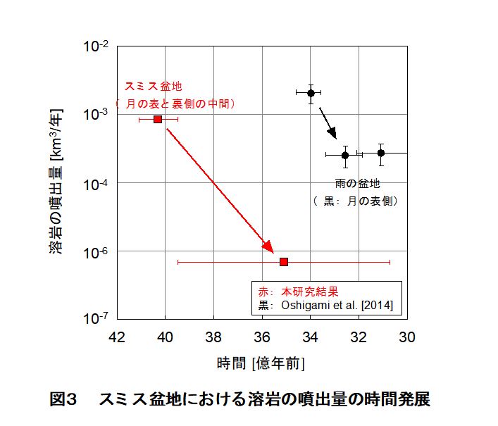図3 スミス盆地における溶岩の噴出量の時間発展。赤点(スミス盆地)は本研究結果であり、黒点(雨の盆地:図1A)はOshigami et al.[2014]の結果である。赤と黒の異なる盆地で、溶岩の噴出量が減少する時期が異なることがわかる。