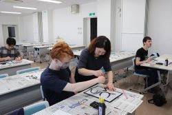 6月7日(水)、21日(水)、今年度受入している短期留学生3名が日本語授業の一環として書道を体験しました。留学生にとって初めての書道ですが、本校の森木助教の指導のもと、基礎から丁寧に学びました。