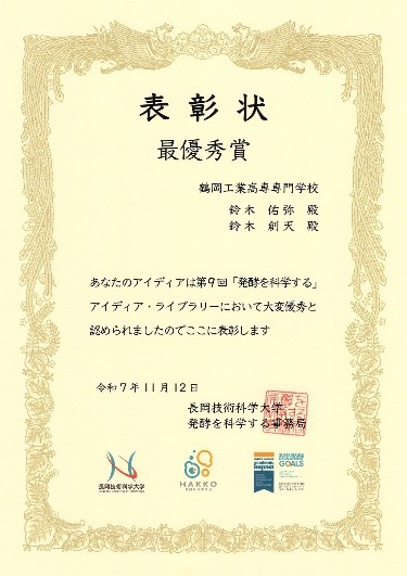 令和7年11月12日(水)、米百俵プレイス・ミライエ長岡(新潟県長岡市)で開催された第9回「発酵を科学する」アイディア・コンテストにおいて、本校の学生チームが最優秀賞を受賞しました。