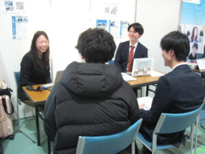 当日出席した学生は各ブースで企業概要や業務内容,福利厚生について説明を受けました。熱心にメモをとり積極的に質問する様子が見られました。