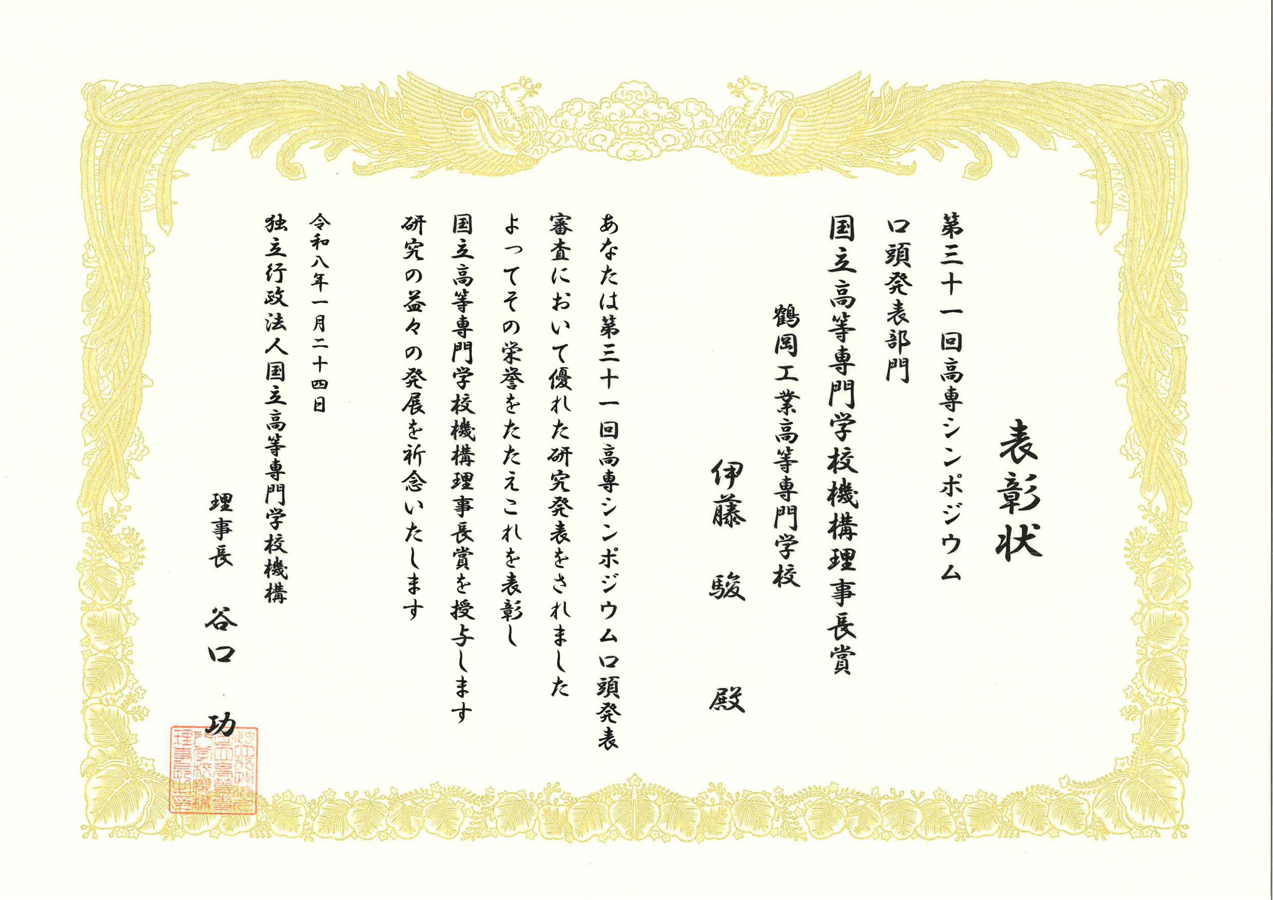 専攻科1年 伊藤駿さんが学会発表で高専機構理事長賞を受賞しました