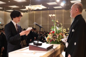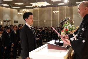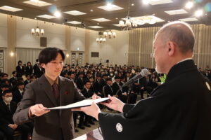 卒業生・修了生の皆さんは、宍戸校長事務代理や在校生代表の大類 崇太(そうた)さん(学生会長・化学・生物コース4年)から激励され、卒業生・修了生を代表し野坂 凌功(りく)さん(化学・生物コース5年)が「本校で学んだ知識と経験を礎とし、どのような状況にあっても挑戦を恐れず、社会に貢献できるエンジニアとして歩み続ける」と決意を述べました。