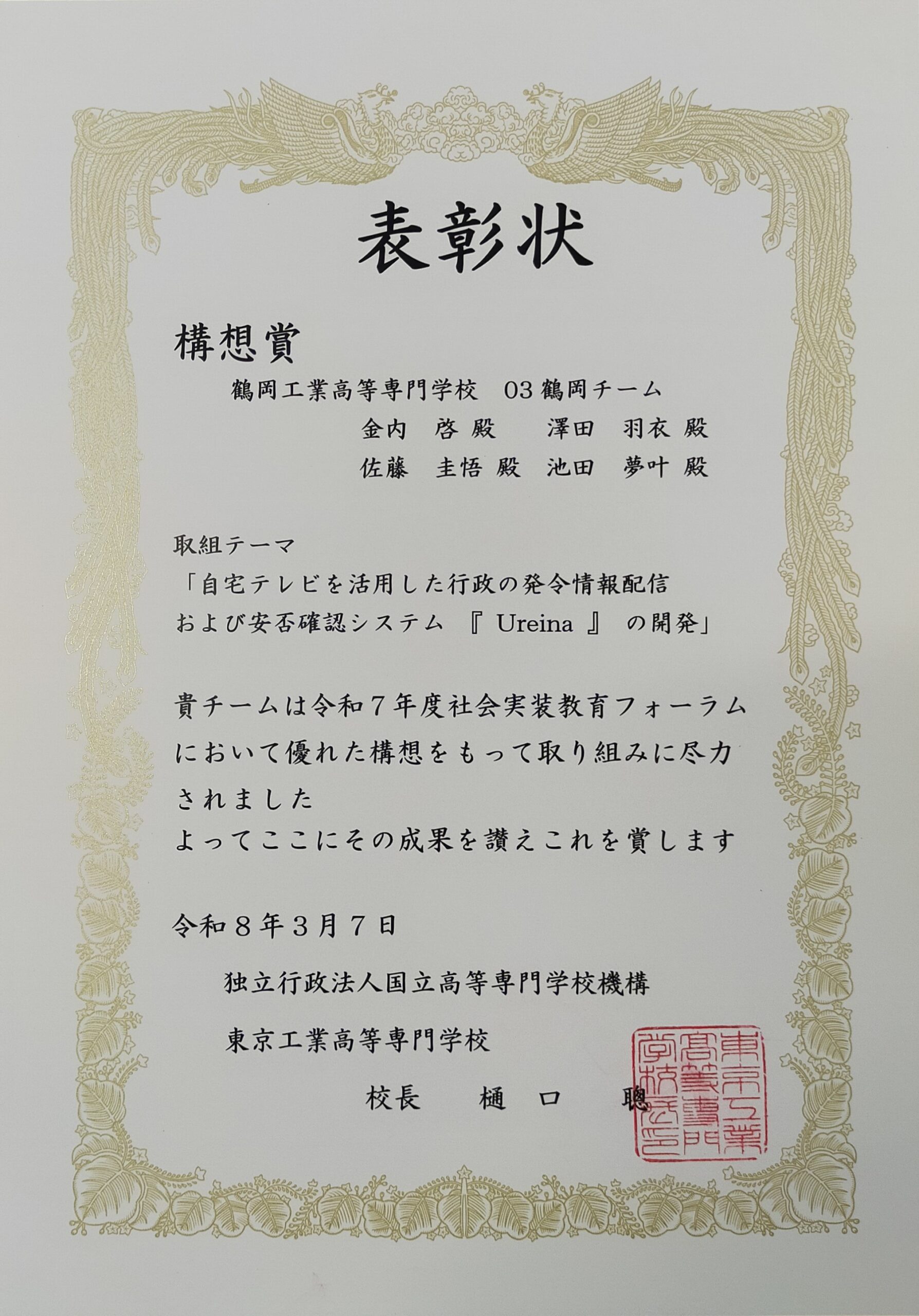 令和8年3月6日(金)~ 3月7日(土)にかけて開催された令和7年度社会実装教育フォーラムにおいて、本校学生の金内 啓さん、澤田 羽衣さん、佐藤 圭悟さん(電気・電子コース4年)、池田 夢叶さん(情報コース4年)が「構想賞」を受賞いたしました。