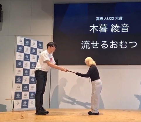 「このたびは、高専人U22大賞を頂くことができて大変光栄に思います。本プロジェクトはクラスメイトの佐藤凜采さん、有路清香さん、五十嵐瑠依さんと共に4名のメンバーで試行錯誤を重ねながら2年間取り組んできたものであり、今回の受賞はチーム全員の成果だと感じています。『流せるおむつ』が子育て負担の軽減、産業におけるロスの減少、焼却による二酸化炭素排出量の削減など、数多くの社会問題に関与し解決の糸口となるよう、これからも本格的な実用化に向けて活動に邁進していきます。また、本イベントで様々な方との意見交換を通して、プロジェクトに対する新たな視点や改善点について多くの学びを得ることができました。」
