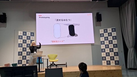 「このたび、私たちのアイデアが評価され、賞をいただくことができて大変嬉しく思います。また、このイベントへの参加を通して多くの方とつながることができ、さまざまな活動を知る貴重な機会にもなりました。そのつながりを大切にしながら、今後も流せるおむつの実現に向けて挑戦を続けていきたいです。」